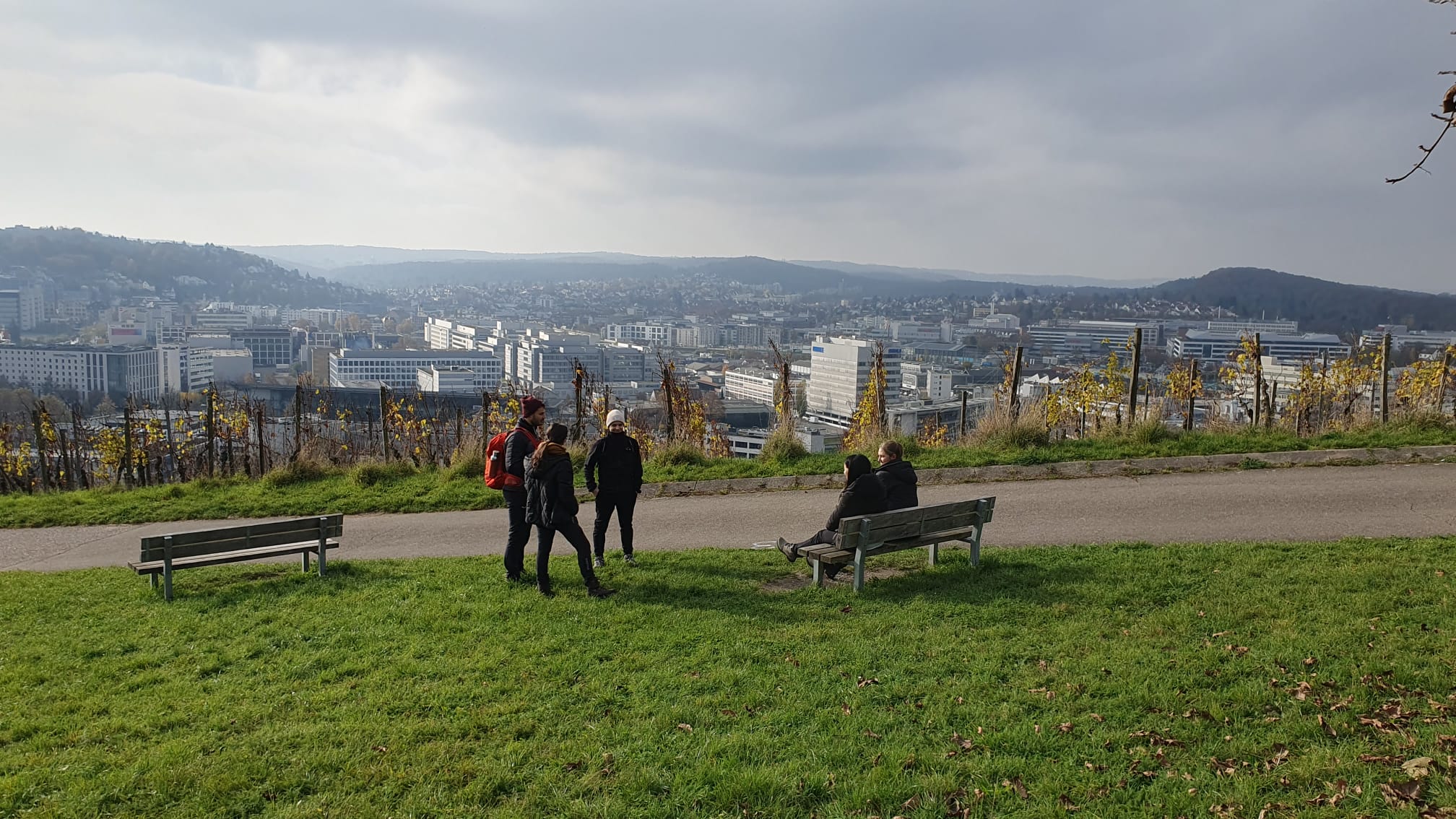 Es ist November und die Weinreben in Südhanglage tragen immer noch herbstliche Farben. Auf einer Straße, aber ohne Kraftfahrverkehr, gehen wir gemütlich bergab, während wir Hallschlag Bad Cannstatt vor uns liegen sehen und in weiter Ferne das Remstal hervorspickt. (Empfehlung: Mehrtagestour Der Remstalweg)